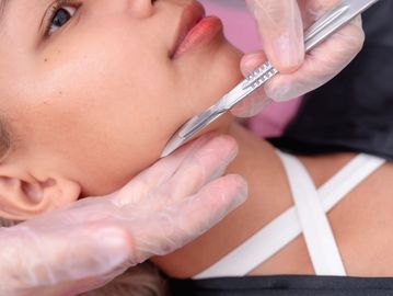 Medical grade dermaplaning is a cosmetic procedure that uses a sterile surgical-grade blade to gently scrape away the top layers of dead skin cells and fine facial hair, also known as peach fuzz. Performed by a cerrtifiprofessional, it results in smoother, brighter skin, reduces the appearance of fine lines and acne scars, and enhances the absorption of skincare products. This non-invasive treatment requires no downtime and can be a good option for those with sensitive skin or who are pregnant.